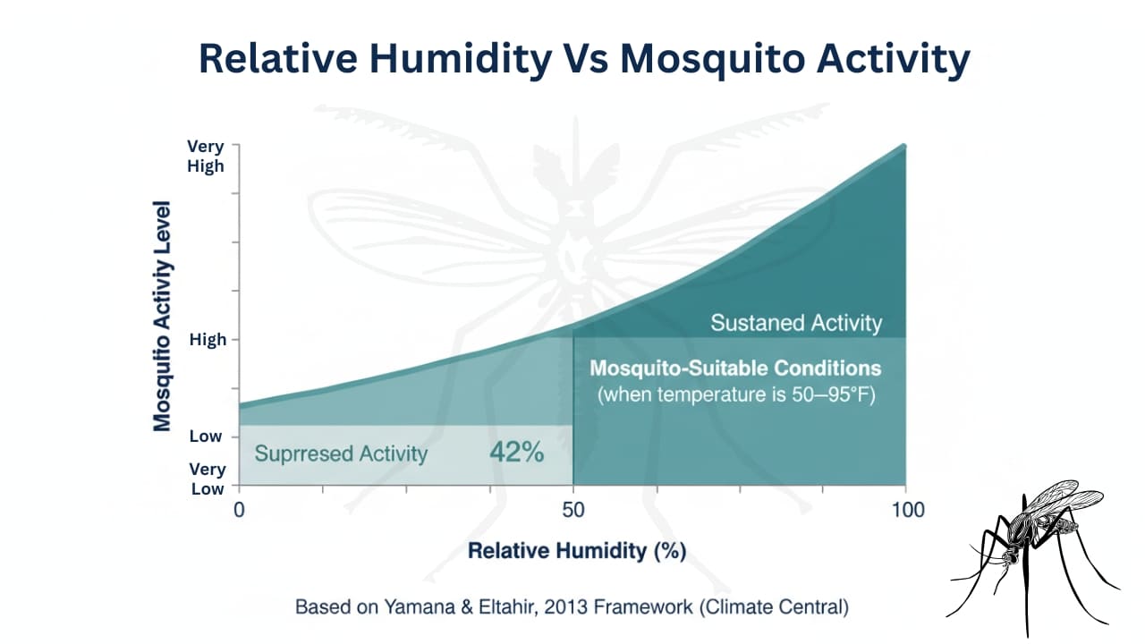 Humidity is a critical secondary driver of mosquito survival and activity — second only to temperature. Mosquitoes have a high surface-area-to-volume ratio and desiccate rapidly in low-humidity environments. The Climate Central mosquito-suitability framework, based on published research by Yamana and Eltahir (2013), defines a mosquito-suitable day as requiring average relative humidity of 42% or greater in addition to appropriate temperature [2]. When humidity falls below this threshold, even temperature-suitable days become hostile to mosquito survival and activity.