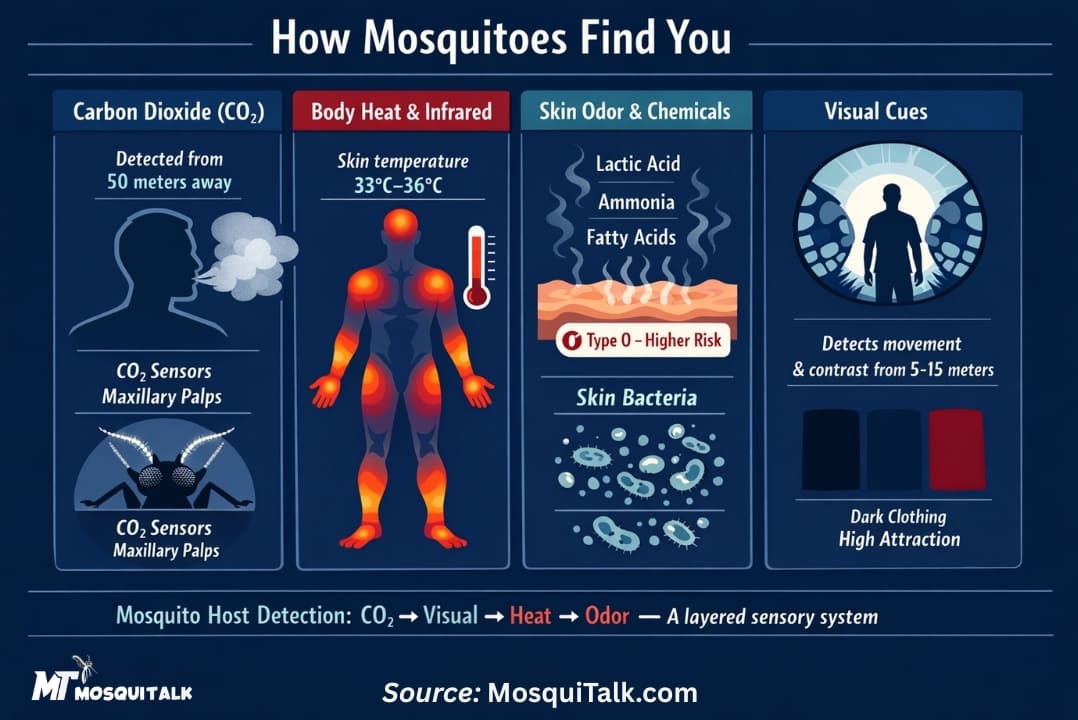 Mosquitoes detect humans through CO₂ exhalation, body heat, and skin odors including lactic acid and ammonia. Humans are large, warm-blooded mammals that are easily detectable — making them frequent targets alongside other mammals and birds.